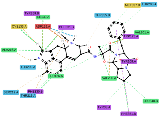 My initial approach used spring_layout from NetworkX — a physics-inspired layout algorithm. While it reduced overlap somewhat, it lacked awareness of which residues interacted with which ligand atoms, leading to visually entangled diagrams (see image below):